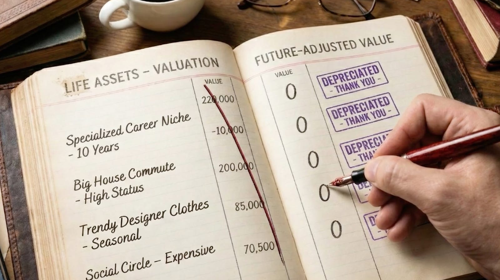 Hold a “write-down” ritual for identity. Businesses write down assets when conditions change, they write off what has become dead weight or doesn’t work anymore. Individual humans might do the same. Name the roles and purchases that served you well and thank them, then explicitly lower their book value in your mind. This might look something like: “I invested a decade in this path. It gave me skills and friends and status. The world has now shifted. I’m releasing that part that no longer fits.”