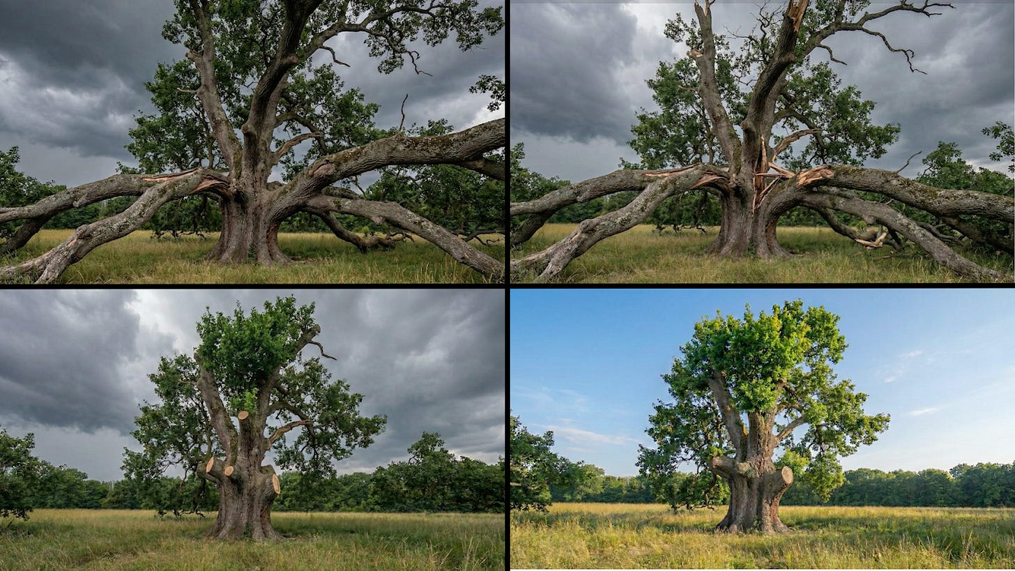 For a closing analogy, picture an oak tree. Decades ago, someone pruned it badly and the tree responded by growing strange, heavy branches at awkward angles. Those branches are sunk costs in wood. If we keep letting those branches grow, the tree will eventually tear itself apart in a storm. A good arborist will study the structure, make careful cuts and lighten the weak points in order to guide the new growth in stronger directions.
