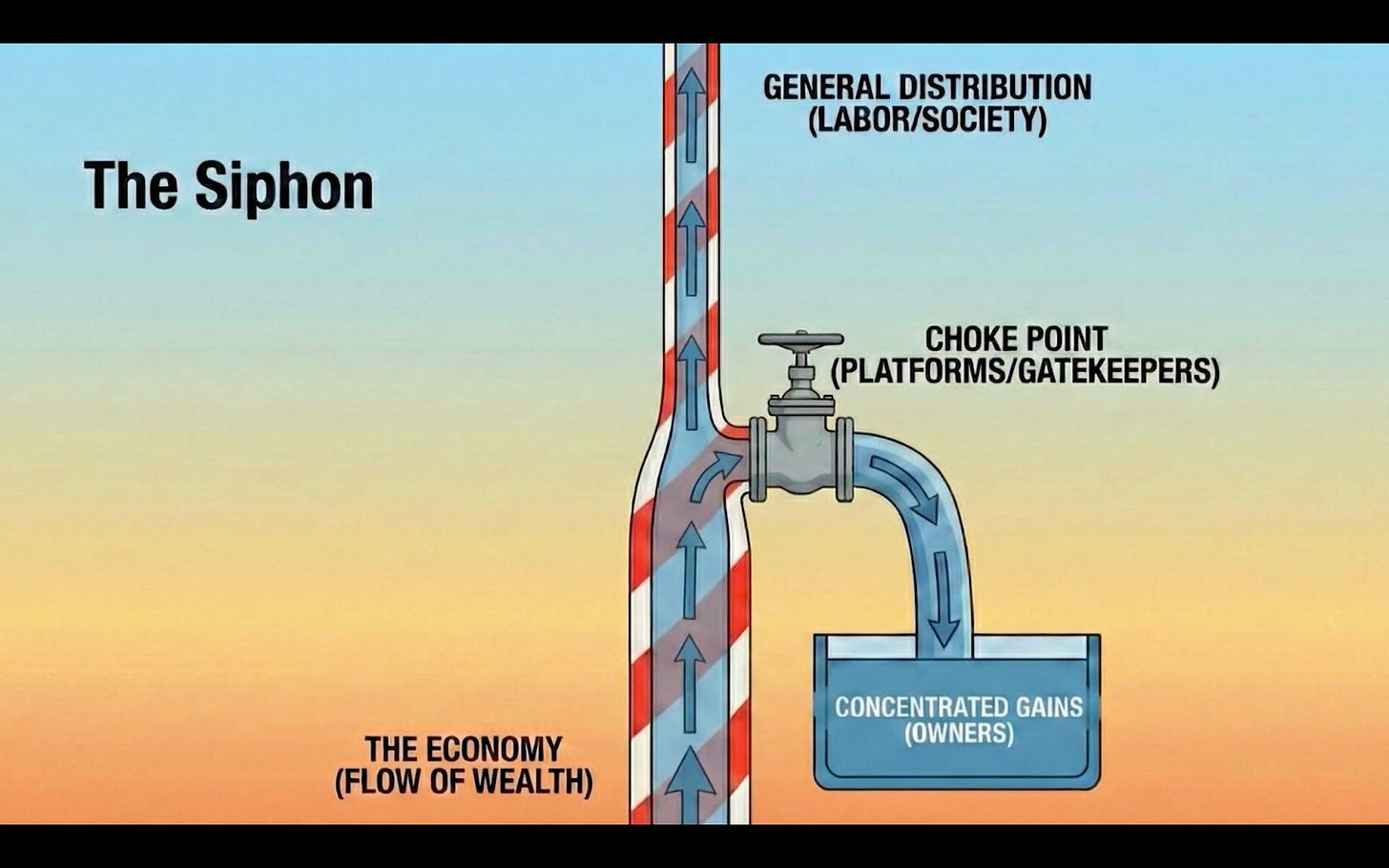 So, as the straw widens, a siphon forms alongside it. Most people experience speed and convenience, but a much smaller group accumulates durable claims. This is why conversations about technology and inequality often talk past each other: one side points to rising output and falling prices, while the other points to precarity, concentration, risk, and loss of agency.
