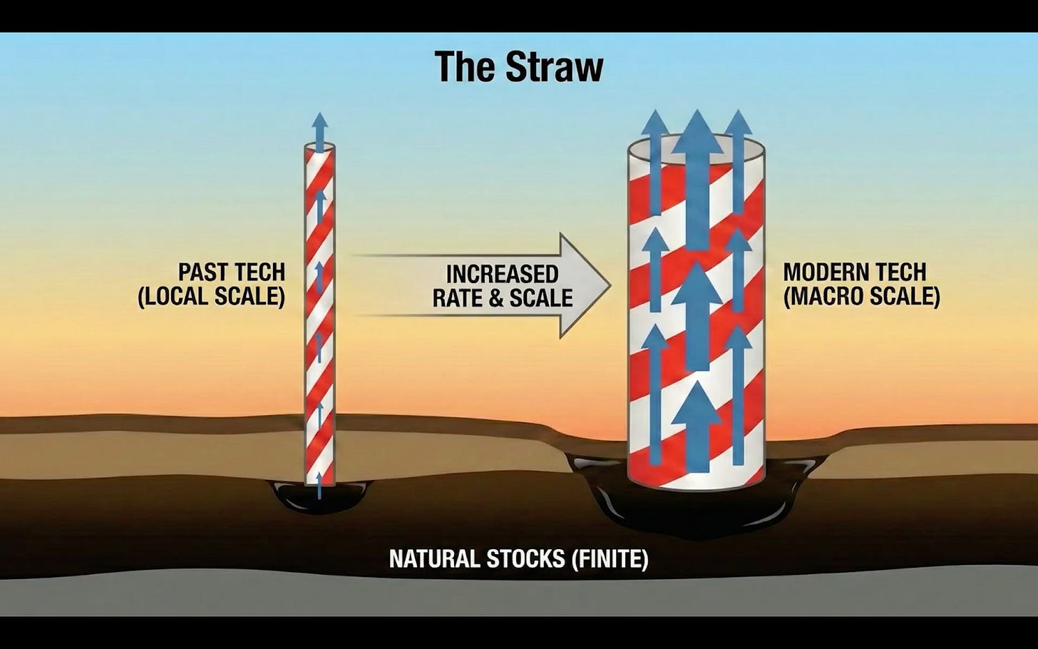 Technology acts like a straw: increasing the rate at which we draw down the stocks of the natural world (such as fracking).