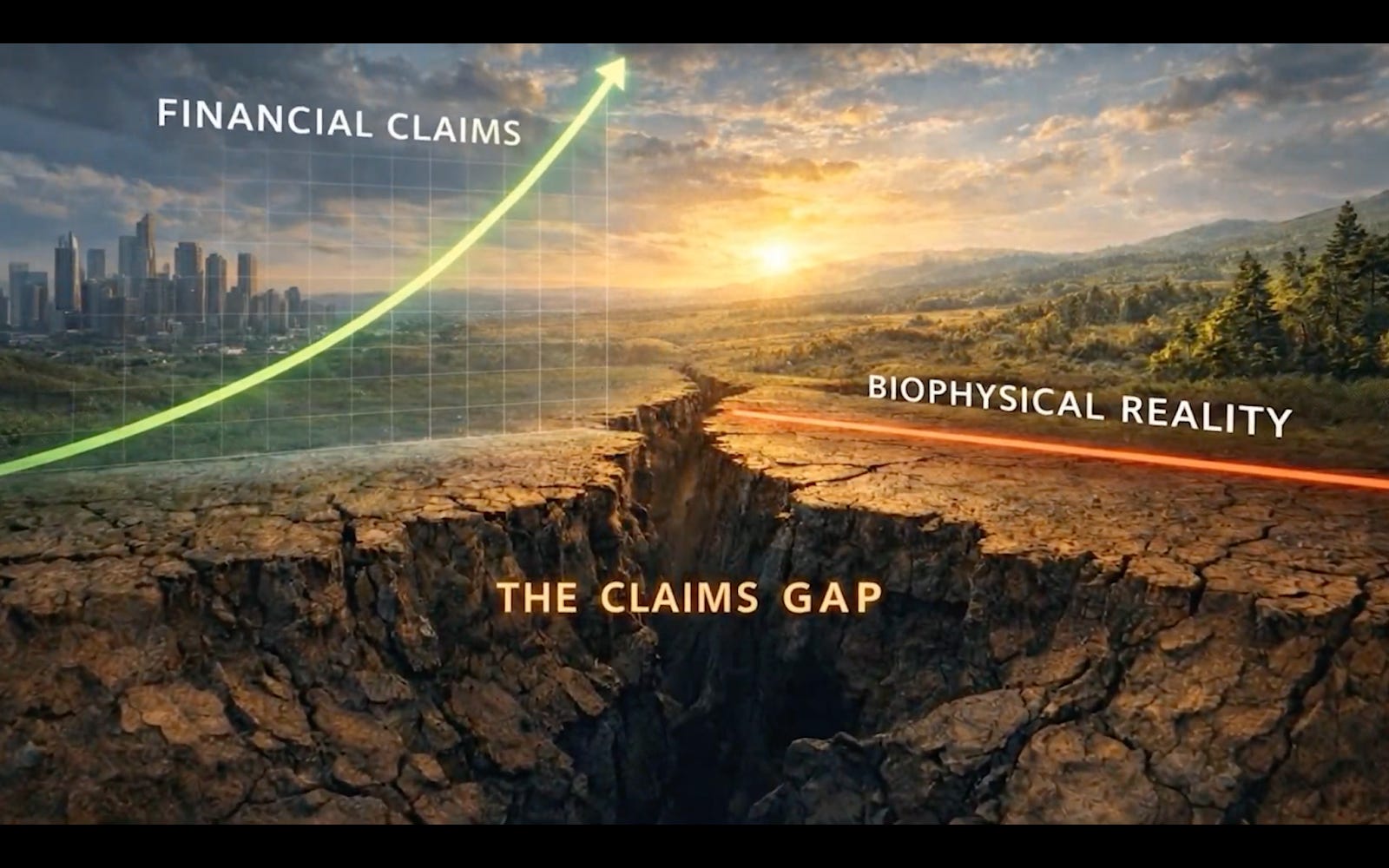 As long as our financial claims grow in rough alignment with underlying stocks and flows, things feel stable. But when claims accelerate beyond biophysical reality, as they clearly are today, a gap opens up. That gap is where fragility lives. It’s where overconfidence and hubris live – and where we mistake abstract claims for abundance.
