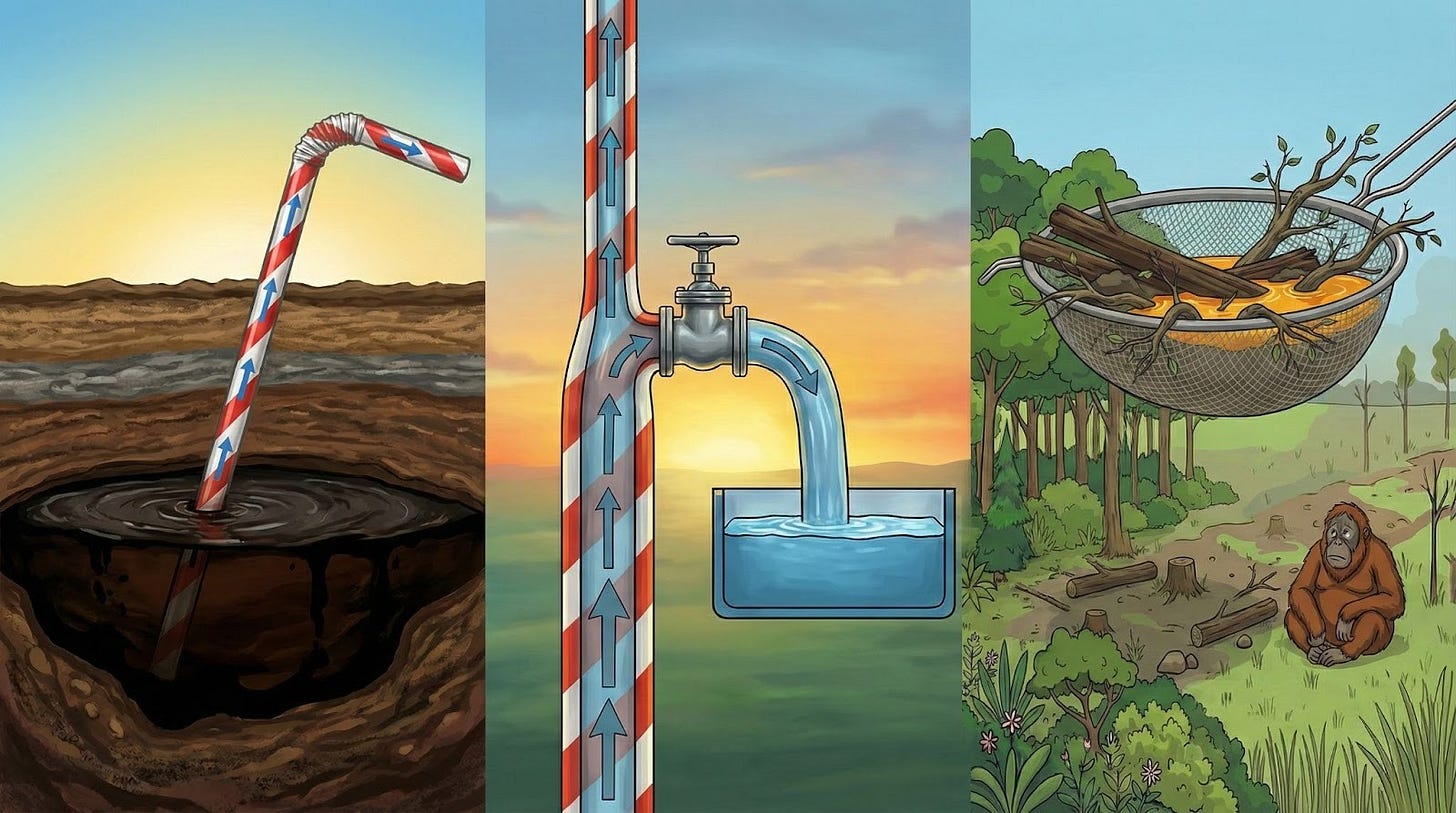 When we take on debt, we’re making a claim on future energy, materials, labor, and ecosystems. We’re assuming those future stocks and flows will be there, and that they’ll be large enough to pay back today’s promises. In that sense, debt acts like a straw pulling the future into the present. It accelerates extraction by allowing us to immediately consume what hasn’t yet been produced.