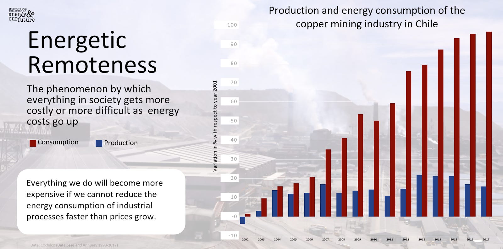We can see an example when looking at copper production in Chile. In the graph above, the blue bars represent copper ore production by the entire country. The red bars show how much energy was needed to get that ore.