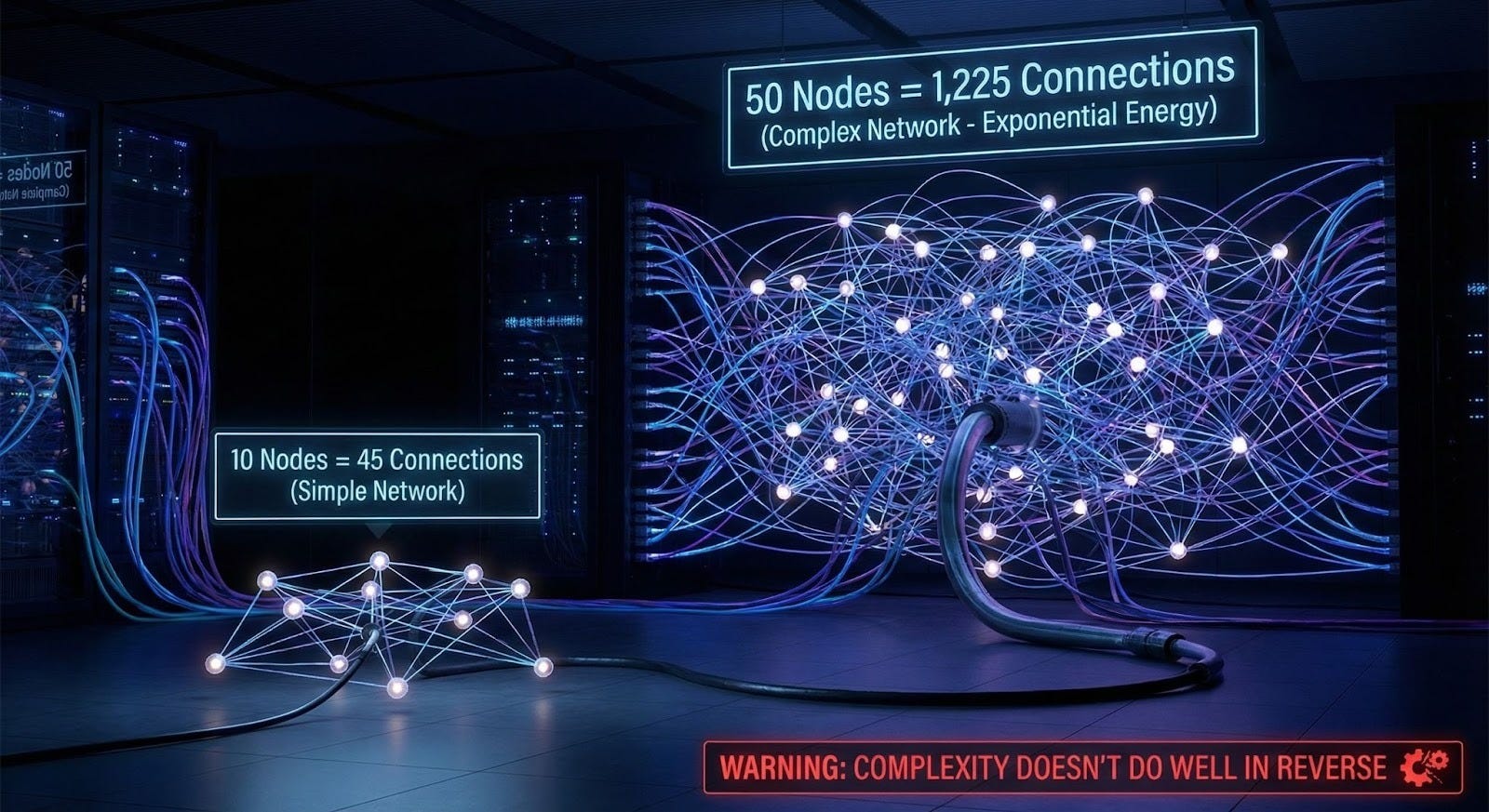 Sustained economic growth has dramatically increased societal – and financial – complexity. When a system grows, we increase the nodes in a network of people, companies, or supply chains. When the nodes increase, the number of connections between the nodes increases by roughly the number of nodes squared and divided by two. So with ten nodes in a system, there are 45 connections. But at 50 nodes, there are 1,225 connections. The exponential nature of connections in society requires more and more energy to maintain, which has built webs upon webs of dependencies and interdependencies.